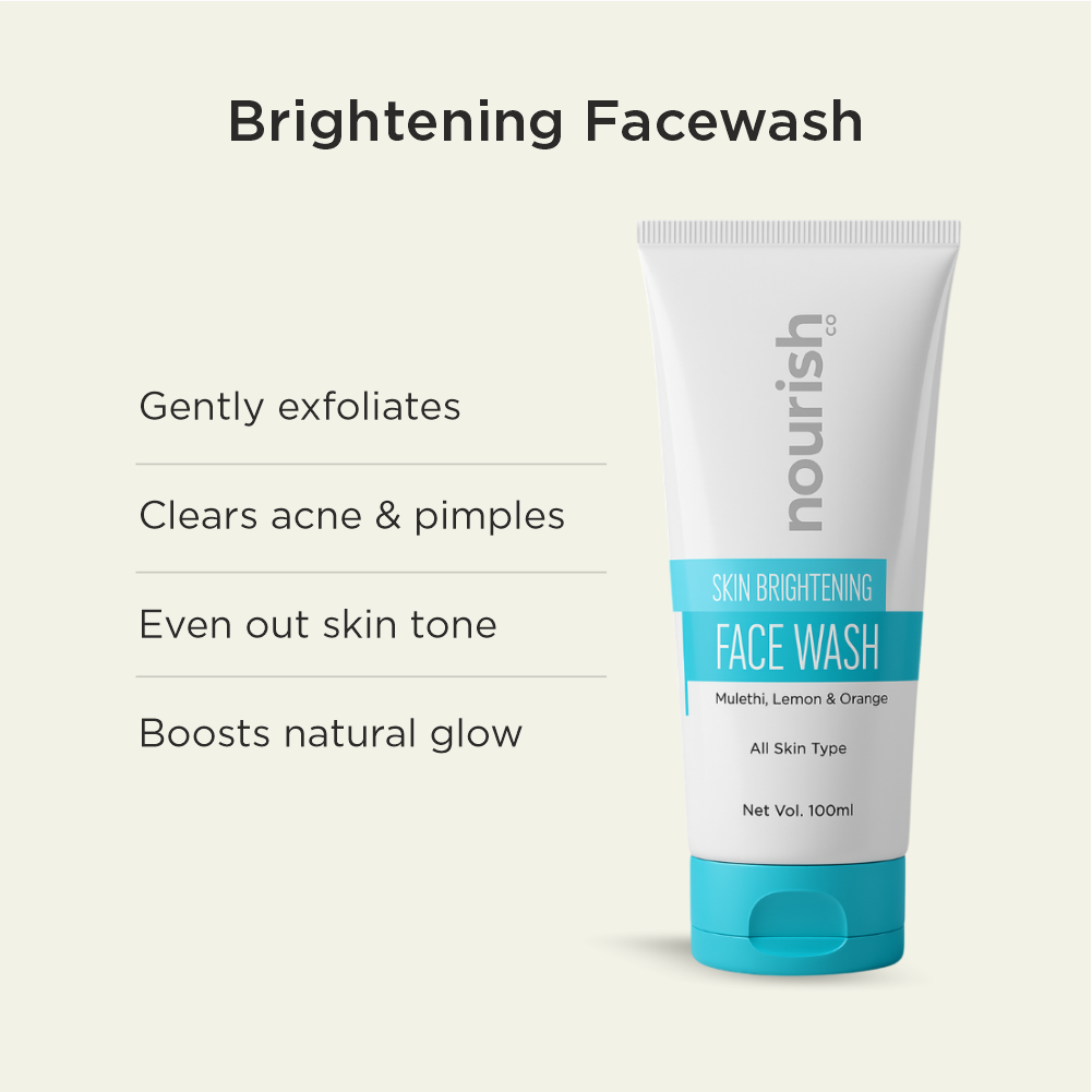 - Brightening Face Wash – Gently exfoliates, clears acne & pimples, evens out skin tone, enhances glow