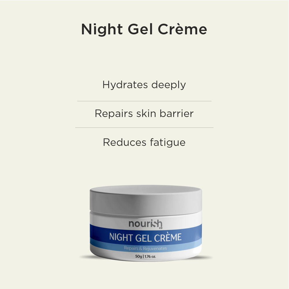 - Night Gel Crème – Hydrates deeply, repairs the skin barrier, reduces visible signs of fatigue